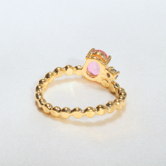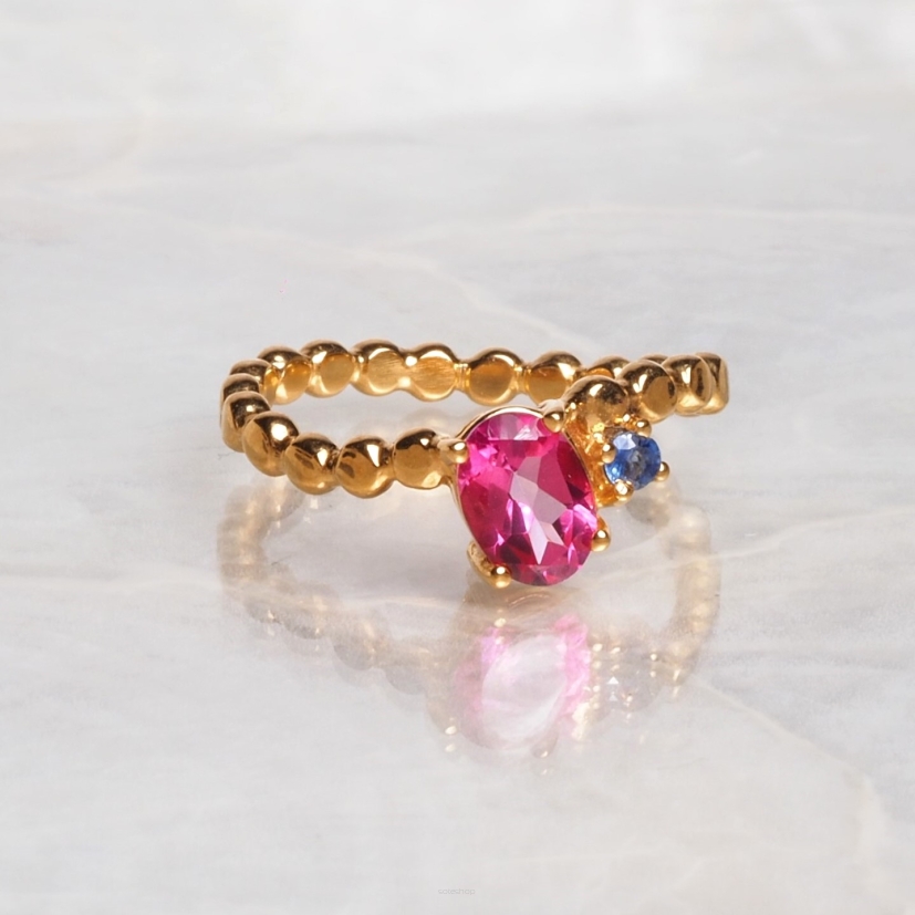 Połączenie dwóch kamieni – różowego topazu i niebieskiego topazu Blue London – jest dla mnie szczególnie istotne. Te kolory razem tworzą kontrast, który pasuje do różnych okazji i pór roku, a jednocześnie stanowią moje ulubione zestawienie. Różowy topaz, z jego delikatnym, romantycznym odcieniem, doskonale współgra z głębokim, eleganckim niebieskim odcieniem topazu Blue London, co sprawia, że pierścionek ma świeży i intrygujący wygląd.
