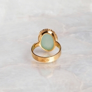 Sygnet z fasetowanym agatem w kolorze błękitnej wody oceanu. Kamień ten jest starannie osadzony w złotej oprawie, której powierzchnia została celowo nieregularnie wykończona, by dodać całości rustykalnego, a jednocześnie eleganckiego charakteru.